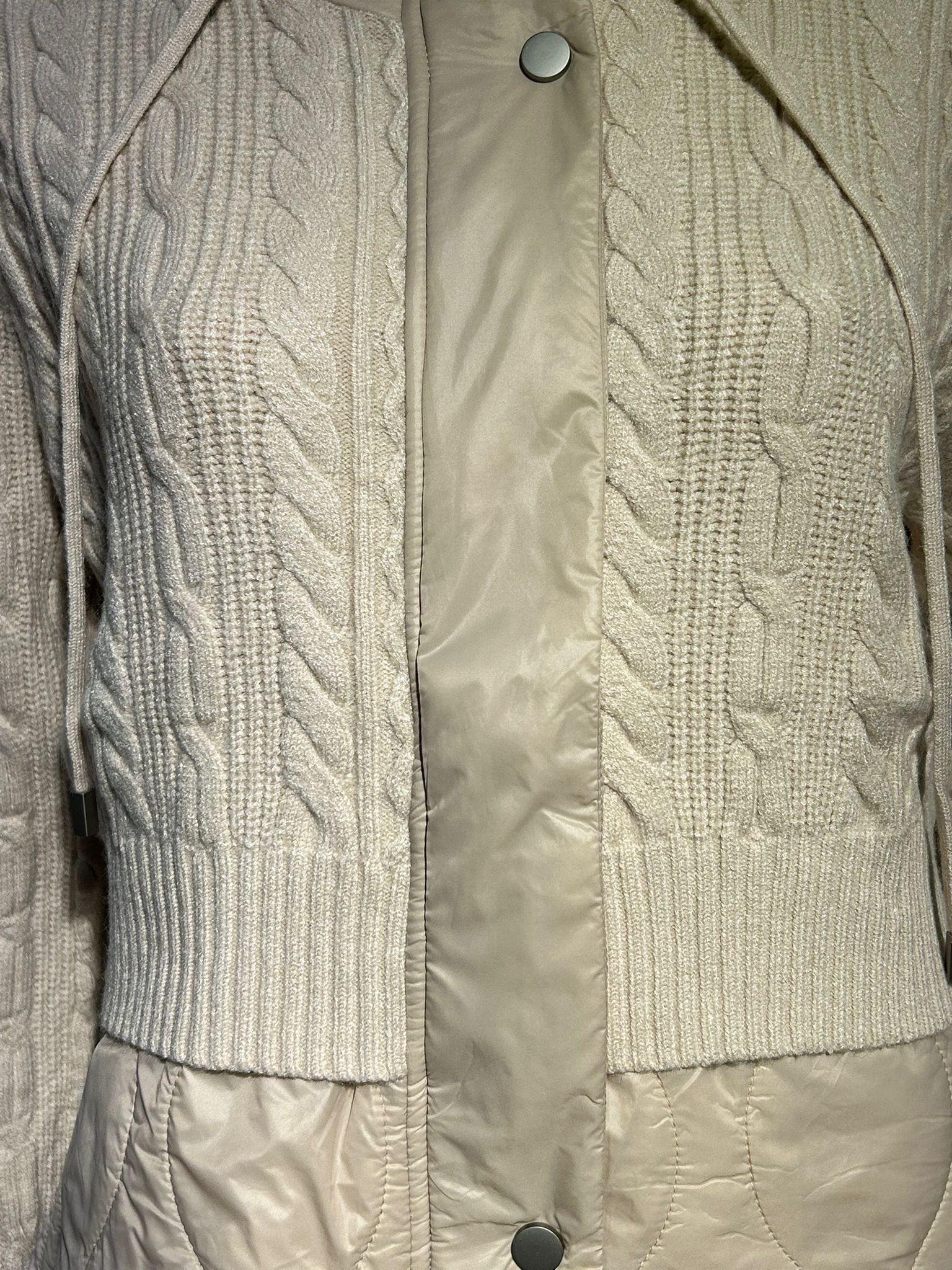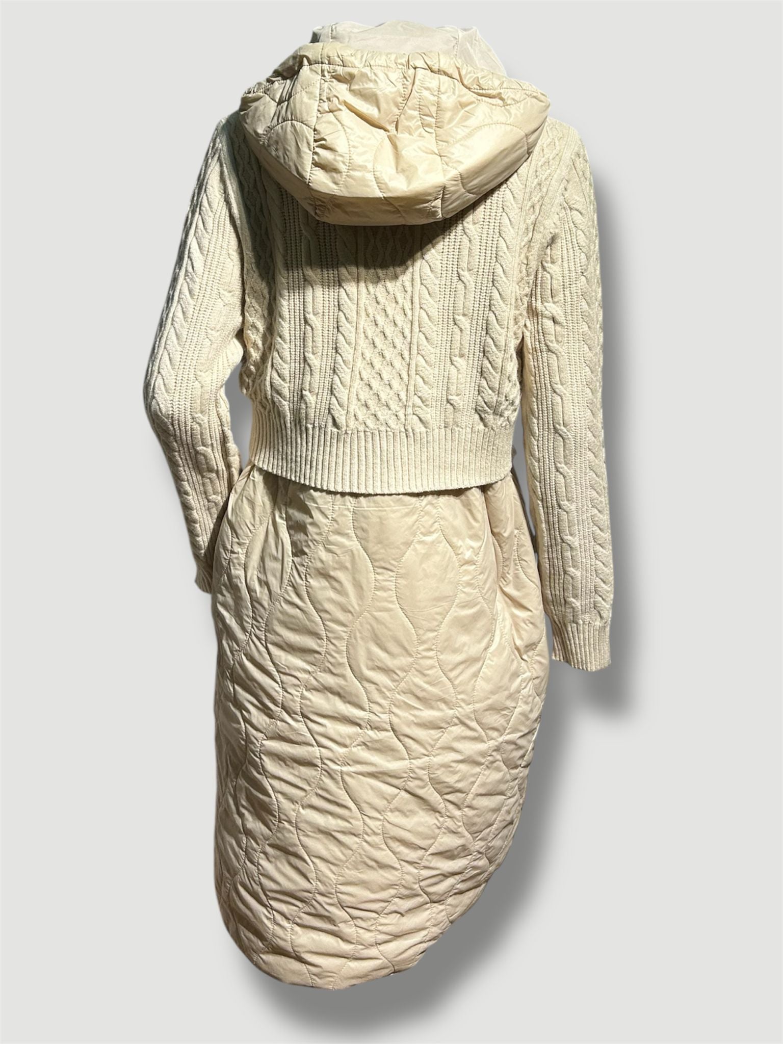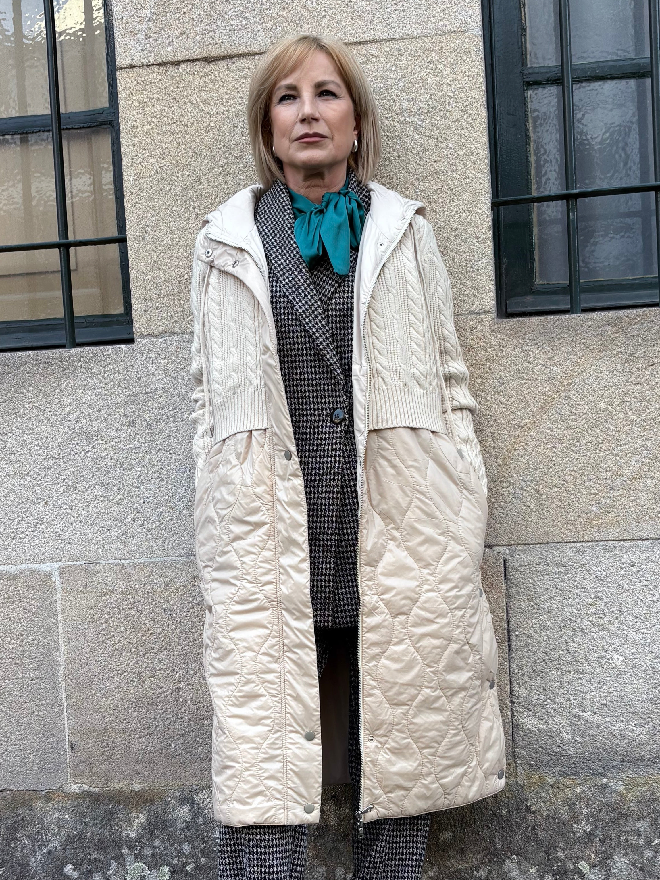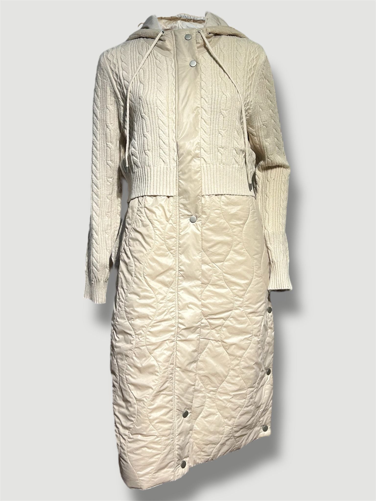 Gabardina acolchada larga con capucha y detalle de punto trenzado en la parte superior. Cálida, ligera y muy estilosa.