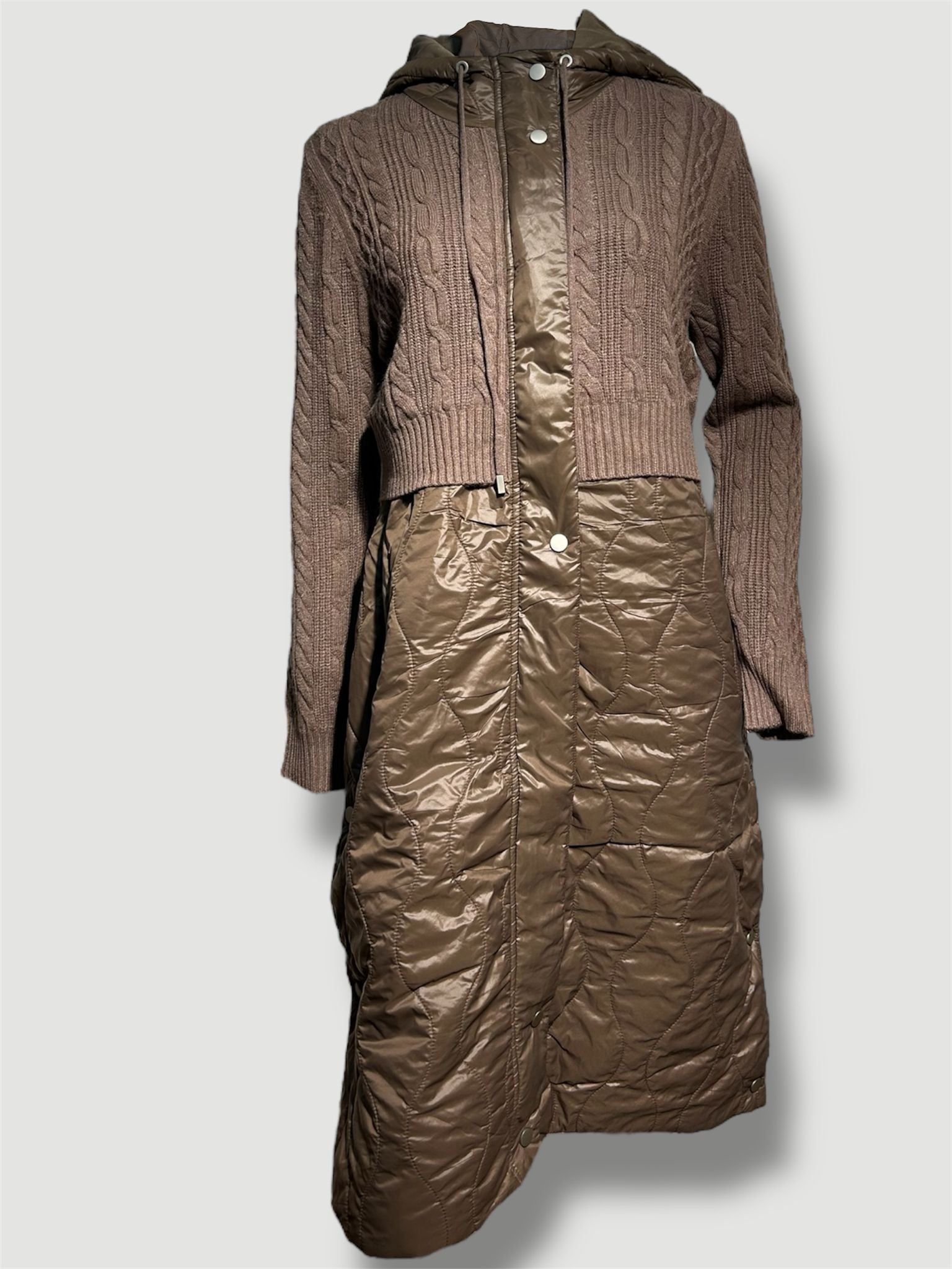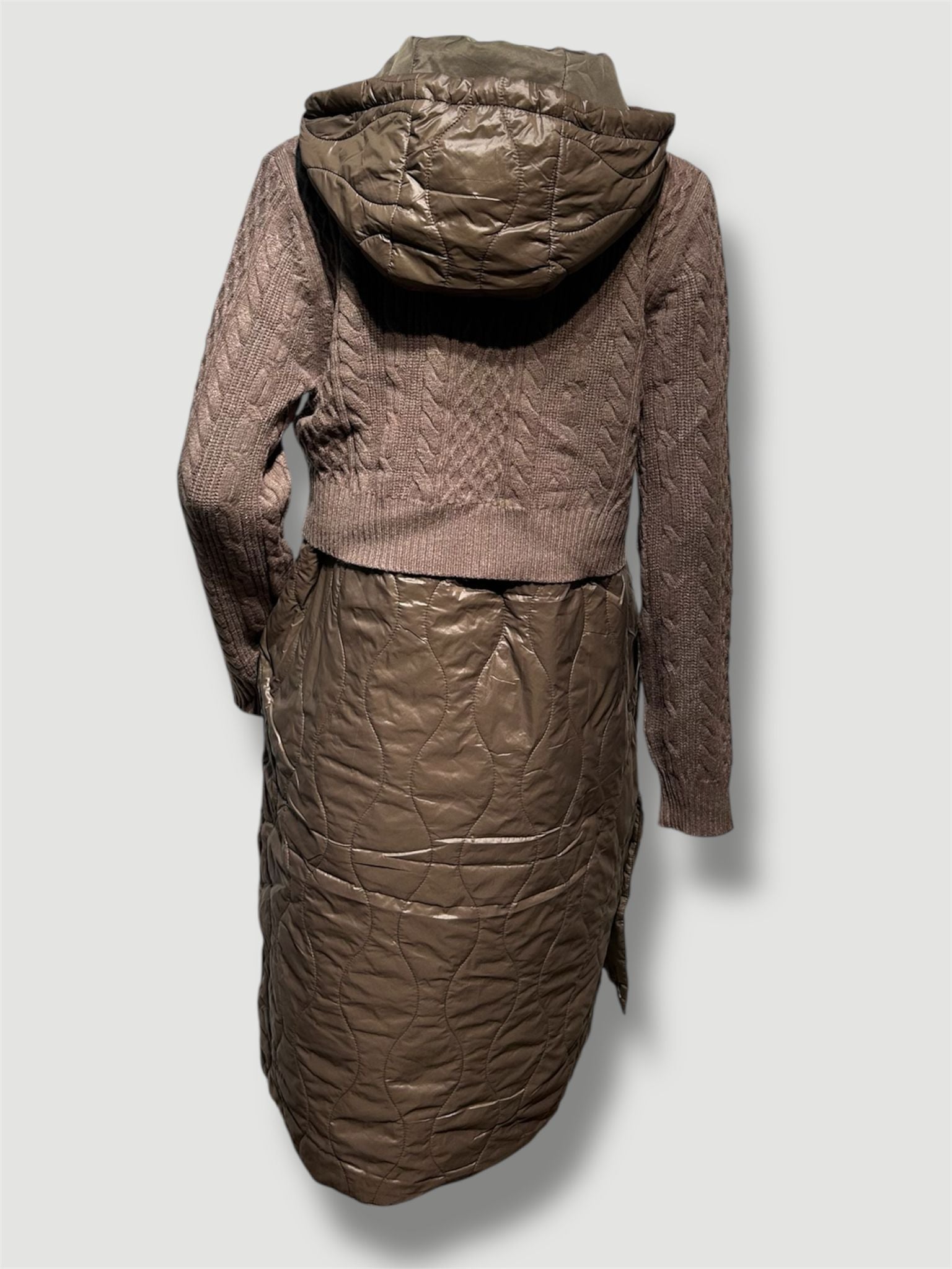 Gabardina acolchada larga con capucha y detalle de punto trenzado en la parte superior. Cálida, ligera y muy estilosa.