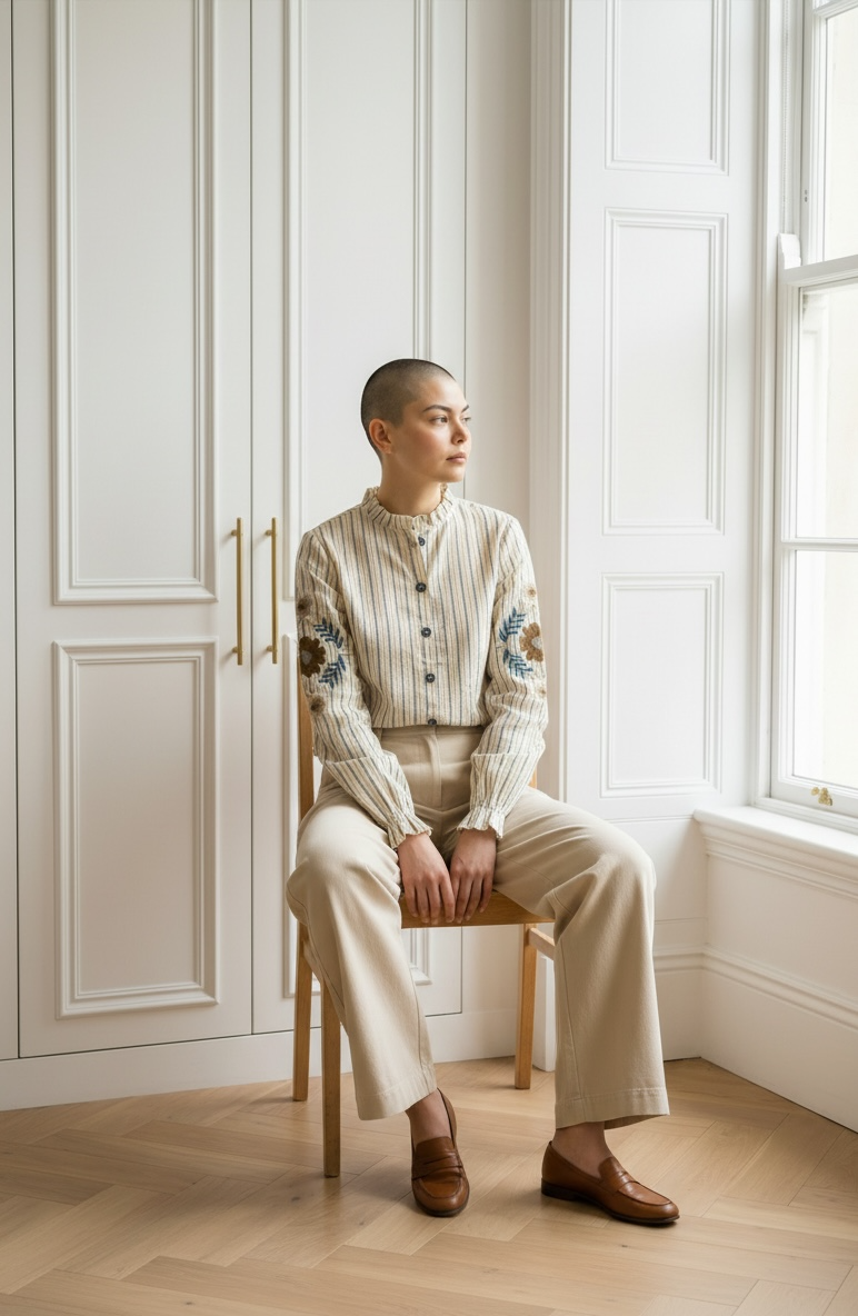 Camisa ligera de algodón con finas rayas verticales y delicado bordado en las mangas.
