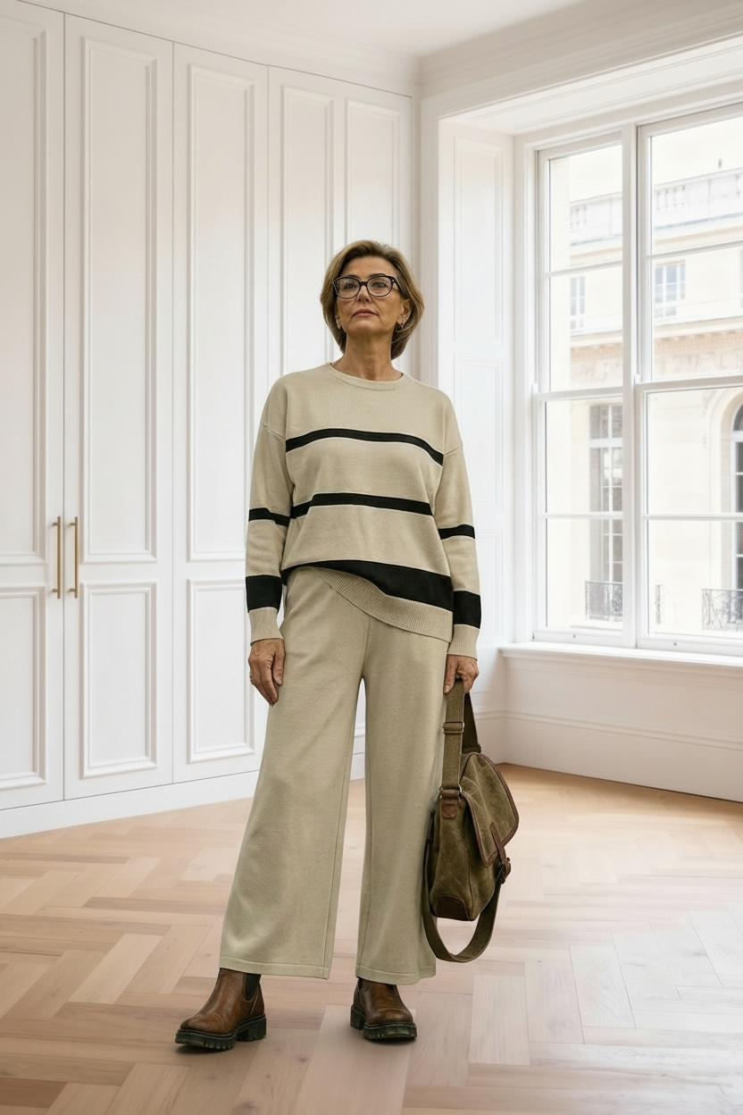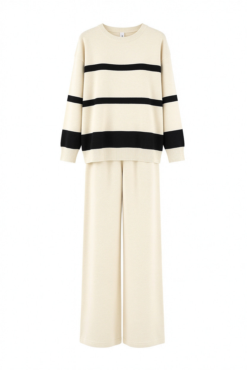 Conjunto de punto cómodo y actual, formado por jersey de corte recto con rayas horizontales en contraste y pantalón amplio a juego.