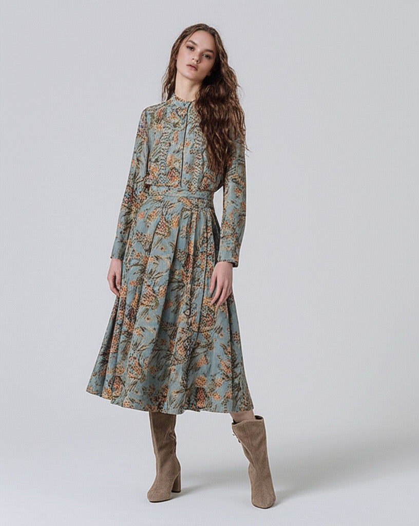 Falda OMSA midi con vuelo multiestampado azul petroleo