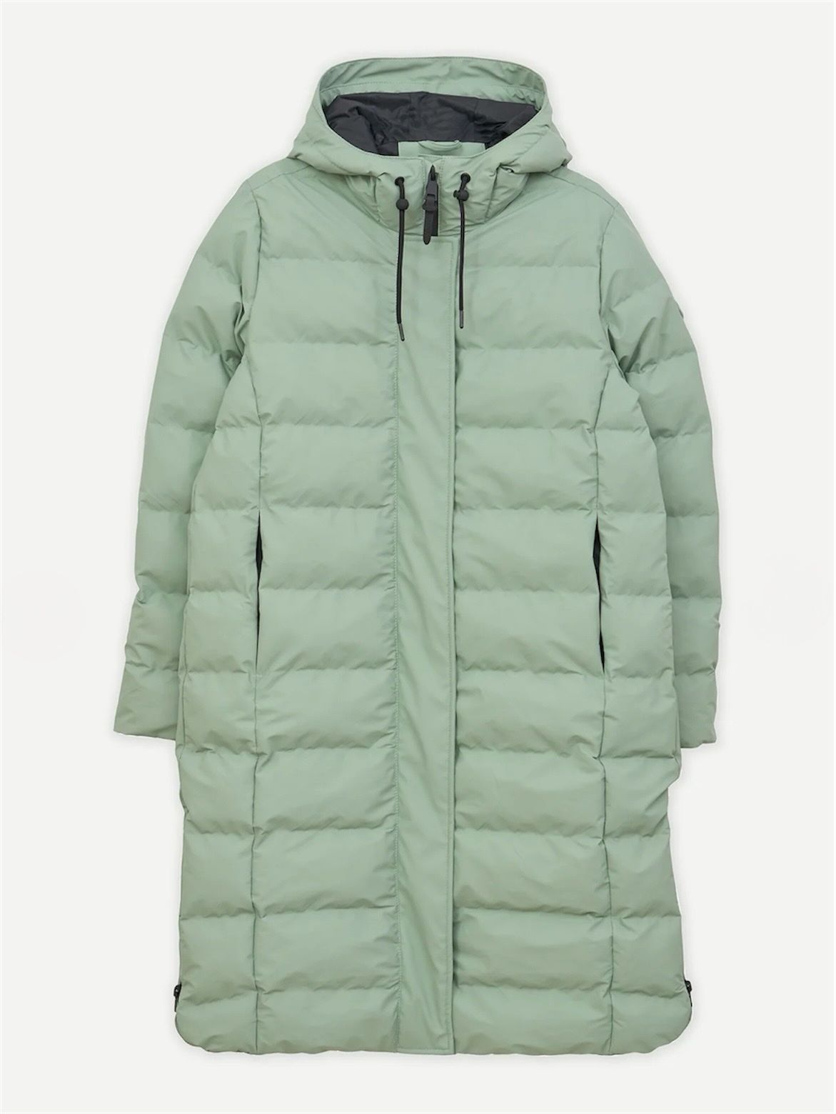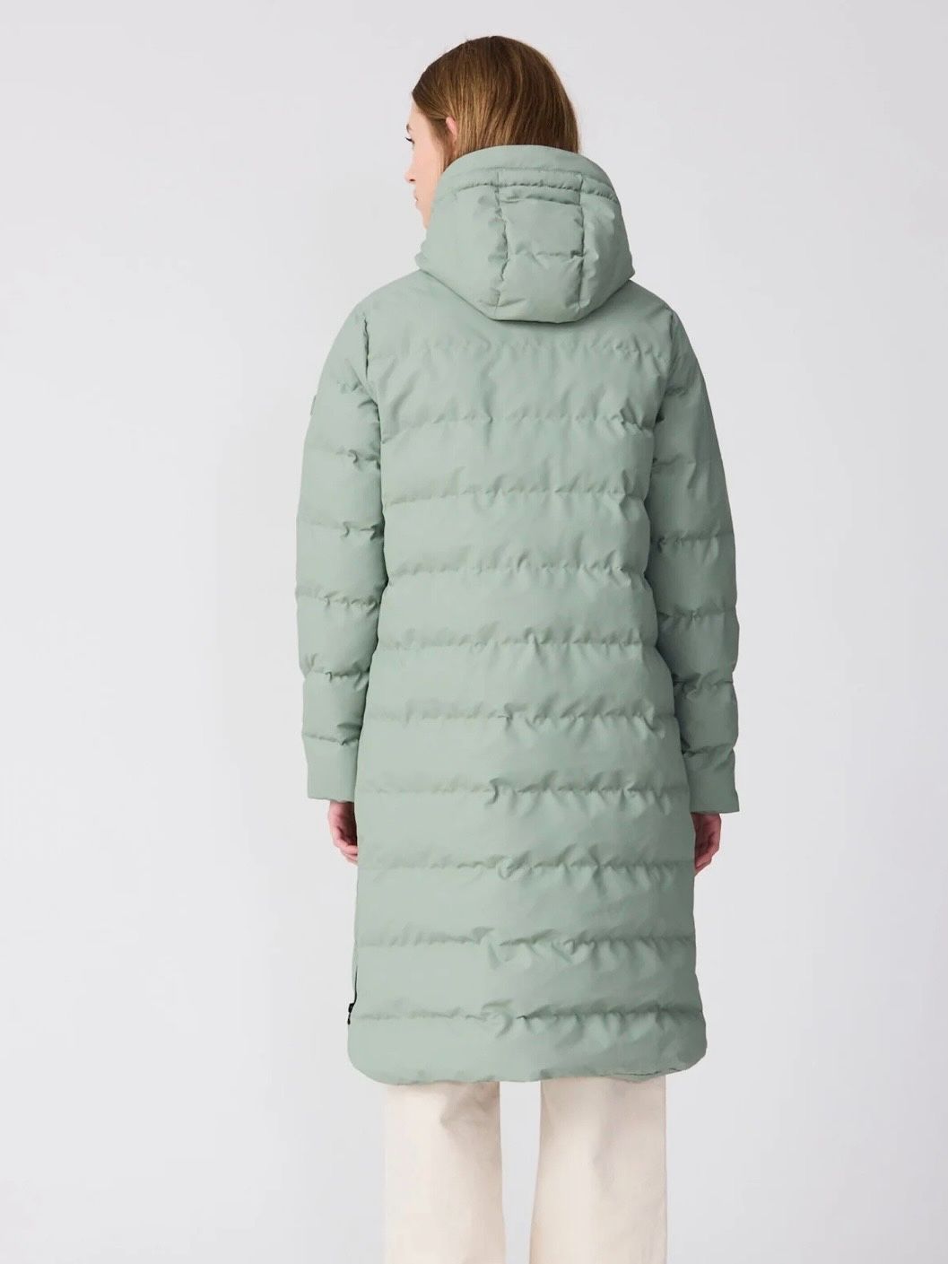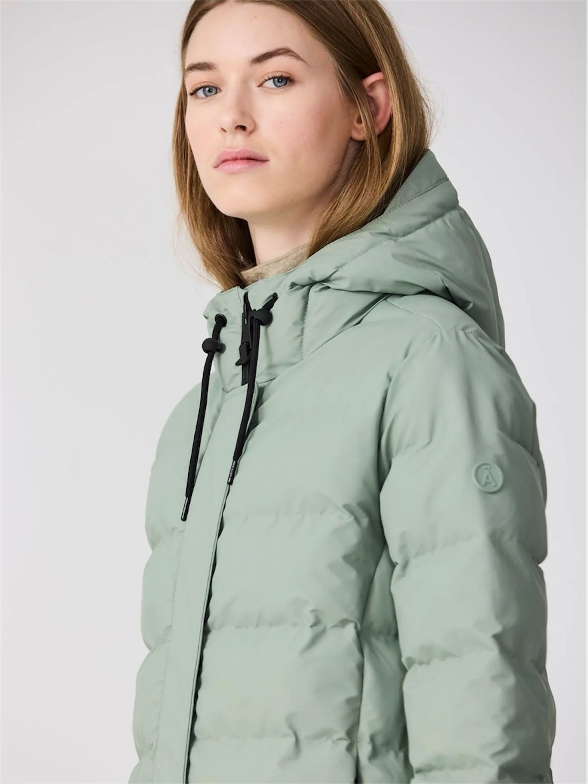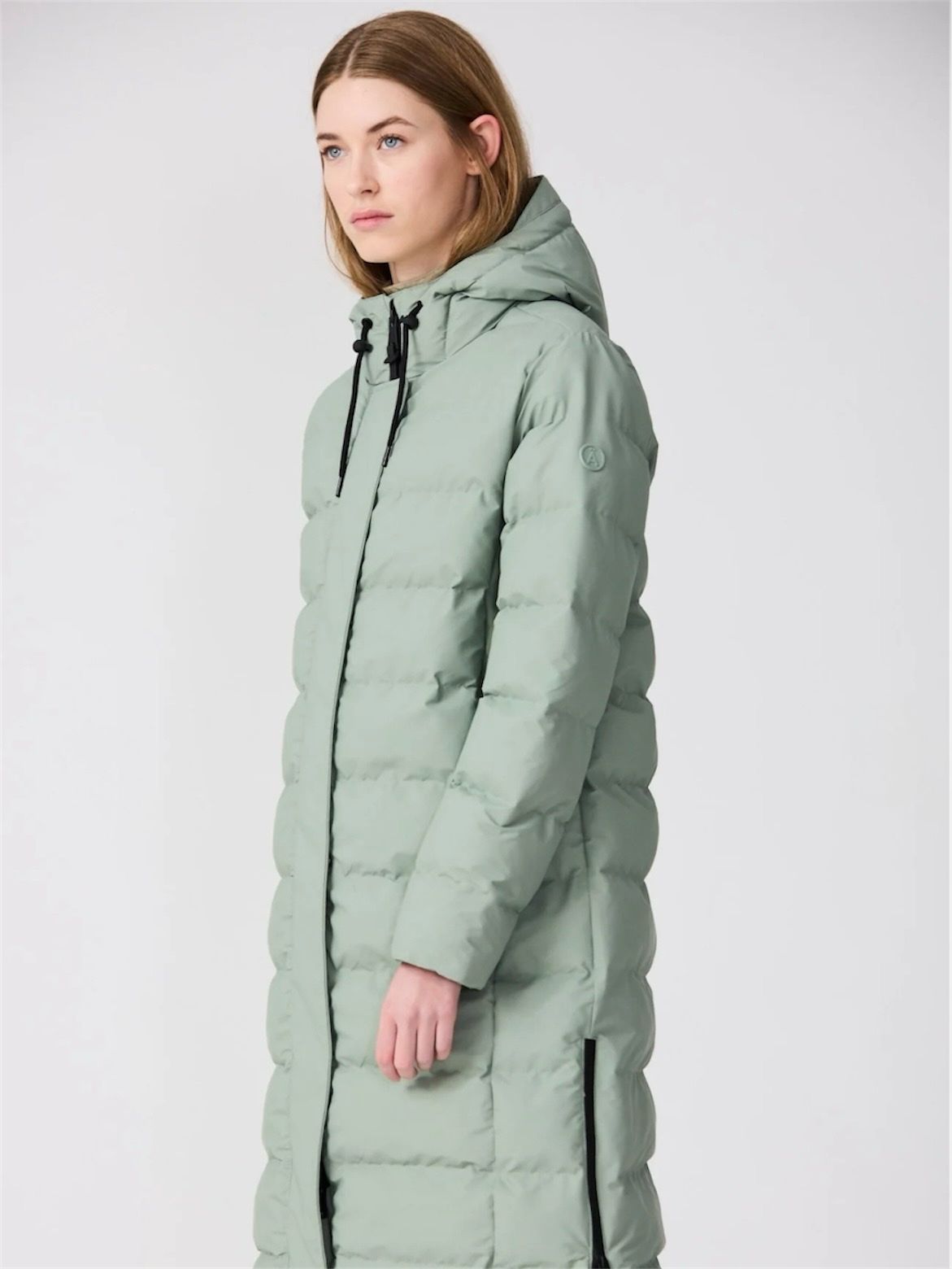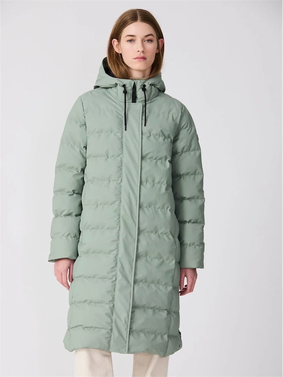 Cremalleras impermeables en los laterales. Capucha de cordón y cuello alto.
