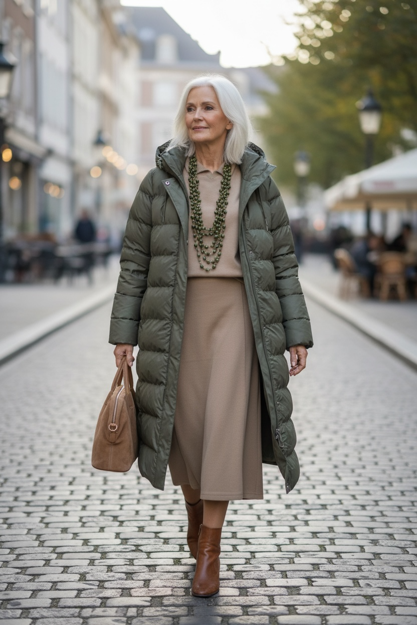 Su largo alarga la silueta y abriga sin agobiar, y el tono kaki la hace especialmente fácil de combinar. Es ideal para el día a día, para caminar mucho y para llevar con vestidos o pantalón sin perder estilo.