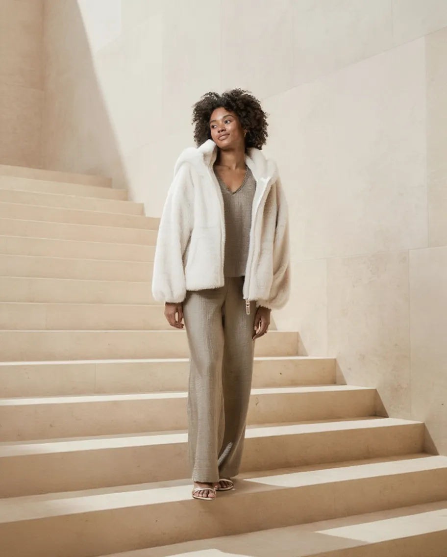 Esta chaqueta de pelo suave tiene ese punto especial que eleva cualquier look sin esfuerzo. Abriga lo justo, es muy agradable al tacto y queda especialmente bonita puesta, sin añadir volumen innecesario.